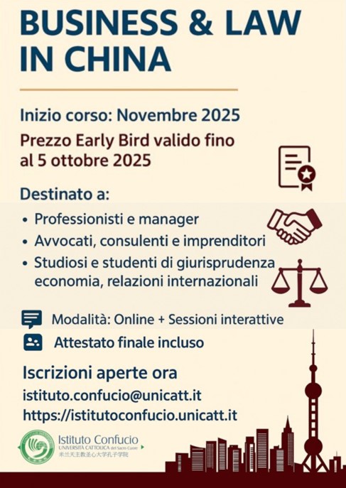 Scopri la nuova edizione del corso Business & Law in China (novembre 2025 - maggio 2026): un percorso formativo per approfondire le dinamiche legali e commerciali della Cina contemporanea. Promo Early Bird attiva fino al 5 ottobre, clicca qui per iscriverti e consultare il programma completo!